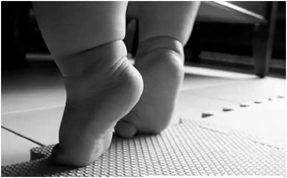 4、护理困难。穿衣时很难将其手臂插入袖中,换尿布时难将大腿外展,洗澡时不易将拳头掰开。家长反映“孩子不爱洗澡”,当脚刚触及浴盆边缘或水面时,背部立即僵硬呈弓状。