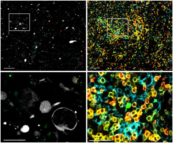 右侧图:胶质母细胞瘤患者治疗后175天,肿瘤浸润性免疫细胞(黄色、绿色、青色)数量增加17倍。左侧对照图为进行脑肿瘤切除术时的情况。