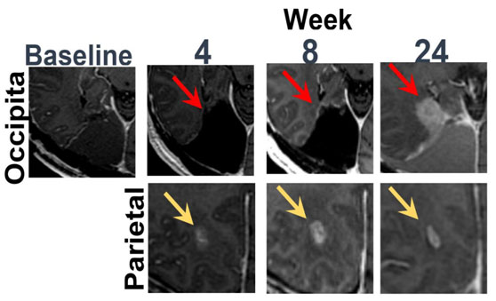 图示:MRI图像追踪一个复发性胶质母细胞瘤病人在接受肿瘤切除术后的进展。