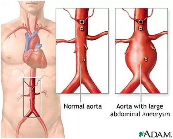动脉瘤可以发生在主动脉的任何部分,最常见于腹部(腹主动脉瘤),也可发生于上半身(胸主动脉瘤)。主动脉瘤过度扩张或太脆弱,就很容易破裂,导致严重出血,迅速致死。