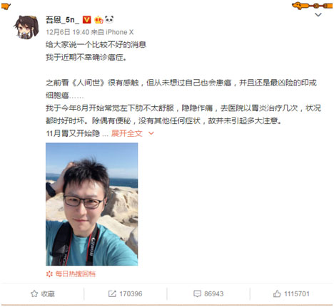 他说:“之前看《人间世》很有感触,但从未想过自己也会患癌,并且还是最凶险的印戒细胞癌。”所幸癌症未发生转移,尚有手术的机会。百万网友纷纷为他打气,他也积极分享自己的抗癌经历。