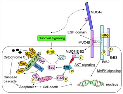 MUC4可抑制促凋亡蛋白(这些蛋白可协助触发细胞的死亡途径),从而使接受化疗的癌细胞在损伤的情况下仍然存活下来。MUC4还作为ERBB2的膜内配体,形成MUC4-ERBB2-ERBB3-NRG1复合物,导致CDKN1B下降,从而抑制细胞凋亡,刺激细胞增殖。