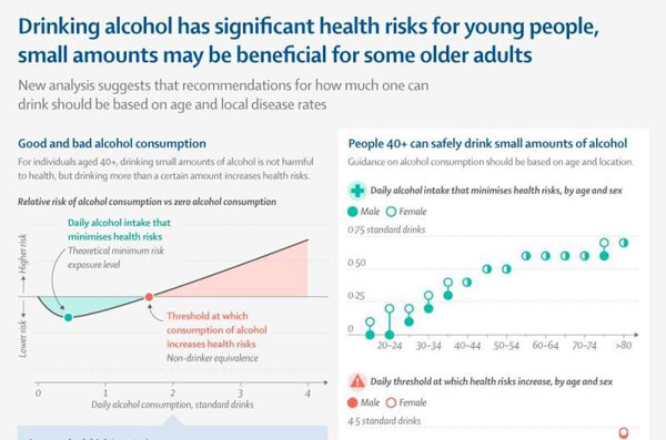 该研究对全球204个国家分析发现,饮酒对15-39岁的年轻人有重大的健康风险,而对于40岁及以上没有潜在健康问题的人群,少量饮酒反而有益。