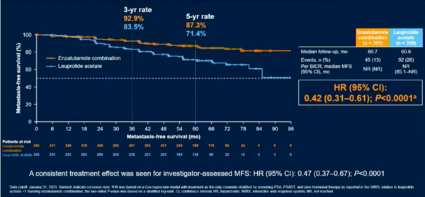1、与安慰剂组患者相比,Xtandi联合组患者的MFS明显改善,其转移或死亡风险显著降低58%。