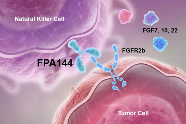 Bemarituzumab是一种创新型、靶向FGF家族FGFR2b的人源化同源异构体选择性单克隆抗体,可阻断FGF的配体信号结合并激活FGFR2b,抑制多条下游途径,从而抑制癌症生长。而且,它还可以通过抗体依赖性细胞介导的细胞毒作用(ADCC)杀伤癌细胞。